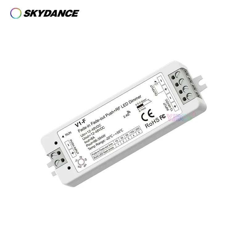 Fade-in Fade-out Push+RF LED Dimmer Model No.: V1-F 5 fading speed/Step-less dimming/Push Dim/Wireless remote control/Multiple defense Features: ● Fade-in Fade-out LED dimmer with delicate fading impression for comfortable start and stop. ● The fading pace could be set by way of knob potentiometer, 1S, 3S, 5S, 10S, 20S selectable. ● Connect with self-resetting steel button or push switch to realize on/off and 0-100% dimming function. ● Push input can accept either effective or detrimental trigger. ● Match with RF 2 single zone or a number of zone dimming hand held handheld remote control optional. ● Over-heat / Over-load / Short circuit protection, get well automatically. Technical Parameters: Input and Output Input voltage : 12-48VDC Input latest : 8A Output voltage : 12-48VDC Output latest : 1CH,8A Output energy : 96-384W Output type : Constant voltage Dimming news Input signal : Push Dim + RF 2 Control distance : 30m(Barrier-free area Dimming grey scale : 4096 (2^12) phases Dimming fluctuate : zero -100% Dimming curve : Logarithmic PWM Frequency : 2000Hz (default) Package include: 1pcs*V1-FFade-in Fade-out Push+RF LED Dimmer