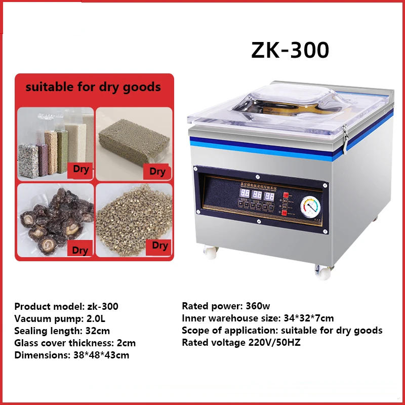 Product model: zk-300 Vacuum pump: 2 Sealing length: 32cm Glass cover thickness: 2cm Dimensions: 38*48*43cm Rated power: 360w Full size: 34*32*7cm Scope of application: appropriate for dry goods Forehead voltage: 220V/50HZ (can be customized 110V/60HZ)