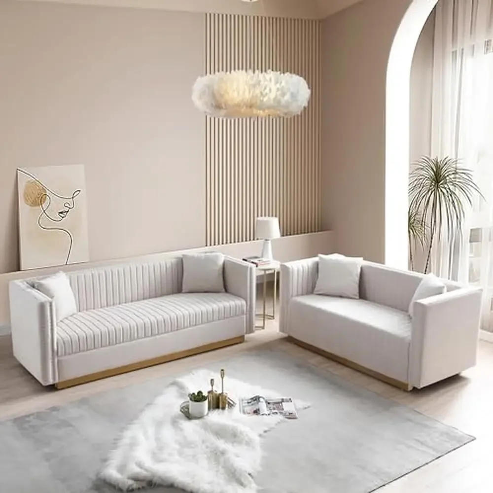 Velvet Channel Tufted Sofa Set with Nailhead Trim and Gold Metal Legs Modern Living Room Furniture Apartments Sturdy Wood Frame