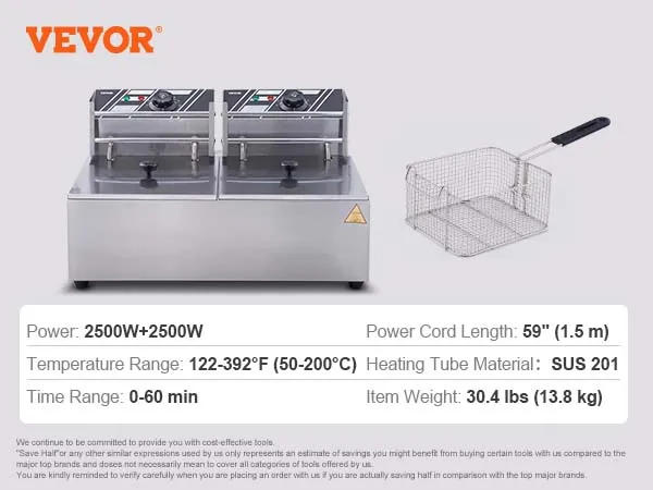 Are you prepared to create mouth-watering meals? An very best piece of equipment in your small business, ideally suited to your snack bars, concession stands, and far more! The dual tank and self sustaining thermostatic control designs allow you to prepare dinner two various meals at the similar time at varied temperatures It's about time you grew to become up the heat! Features & Details Explore Different Foods: By utilizing two separate eleven qt oil tanks, this advertisement electrical deep fryer permits you to fry different types of meals individually and preserve the original flavors of every It also elements 2 spacious detachable baskets with a 4 qt capacity, allowing you to quickly drain and remove meals from the fryer It works well for delis, concession stands, snack bars, and parties Hot Food in No Time: Aren't you uninterested in slow heat-ups? This advertisement electrical fryer is provided with a 1500W heating element in each tank, allowing it to warmth oil for your desired temperature in a short while It's about to get hot! You can easily cook dinner your food quickly and punctiliously NOTE: It is usually recommended to use separate socket plates for every of the 2 plugs to play down the risk of unexpected lack of energy (please plug right into a wall socket instead of a wiring plate-type socket) Set the Temp & Time: Thanks to the self sufficient thermostatic control on every single tank, you can easily modify the temperature from 122°F to 392°F (50-200°C) No subject what, you'll be ready to deliver at the heat! It additionally features a thermal shutdown mechanism, allowing you to cut off the ability if the oil reaches a temperature of 446°F/230°C In addition, the commercial deep fryer is designed with timers, so you will not omit a thing You can set the time from 0-60mins per what you're cooking! Detach and Clean with Ease: Luckily, its heating tube can be smoothly flipped up, which facilitates a simpler cleansing after each use And wager what? The stainless-steel outdoors makes it smooth to wipe down Also, every single tank comes with a front-mounted drain valve for effortless oil launch Detailed Just for You: The coated, cool-touch manage ensures completely happy use for extended use The well-matched disguise minimizes scorching oil splashes Two stainless steel brackets rest above the heating tube and separate the frying basket, so it won’t touch with the heater Additionally, the entrance hook makes it clean to hold the basket up to drain oil quickly Timing with Filter no Timing no Filter