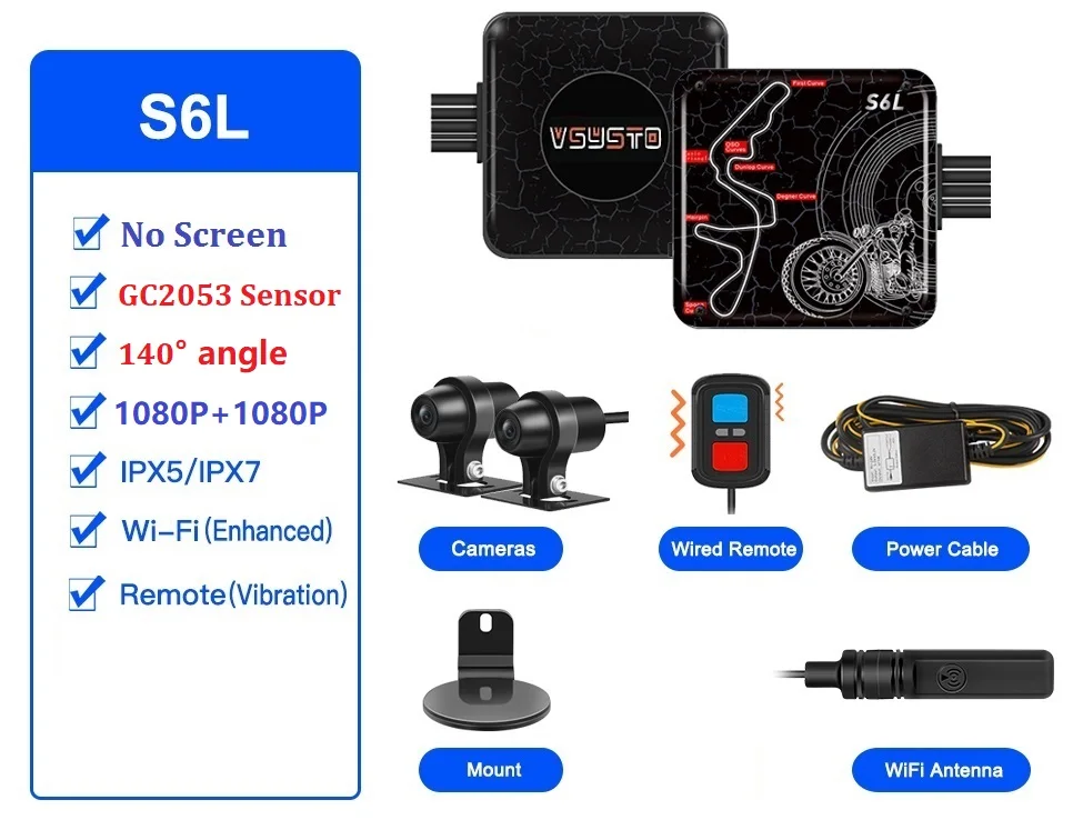 24 Hours Parking Monitor (Q6UL/Q6DL) When you join the power cable in your bike, the DVR will routinely switch to parking mode while your bike is parked and the engine is turned off, performing as a surveillance digicam formula that robotically information video when it detects bumps or physical motion front and rear cameras record for 30 seconds after an affect after which shut down to minimize strength intake ※ S6PL doesn&;t support the parking mode function Superb Image Quality & Night Vision ● VSYSTO Q6L facets Mstar CPU that records at 25 frames according to moment in 1920x1080 resolution The in-built Iconic Brand IMX307 CMOS image sensor, 6-layer all-glass, and 140°/150 broad perspective lens present you superior image quality and large photos The Iconic Brand Starvis tremendously enhances night imaginative and prescient within the low mild environment, making your riding more secure at evening ● VSYS S6PL facets Mstar 8339 CPU that information at 25 frames consistent with second in 1920x1080 decision The integrated GC2053 CMOS image sensor, 4-layer all-glass, and 140° wide-angle lens present crisp, tender photos WiFi Connection & GPS Tracking The camera has build-in WiFi and video management, so that you can smoothly join it to the app and entry all its elements from your cellular device Whether you prefer to preview, playback, configure the camera, or obtain the video files, you are able to do it all directly from the app This digital camera also elements GPS tracking, so that you can easily tune your course and speed when gambling movies on the WiFi app The app is offered for either iOS and Android This makes it easy for anyone to use Boost Your WiFi Experience Equipped with an external WiFi antenna , our digicam can achieve download speeds of up to 2M according to second, permitting you to soon and easily entry and download your movies with none irritating delays or ready intervals Remote with Vibration Alert Never pass over out on recording your adventures back with a build-in vibration module at the remote controller In case of any digital camera malfunction, the distant controller will vibrate to alert you Whether it&;s an unreadable memory card or a digital camera that has stopped recording, the vibration detection formulation will make sure you are continually responsive to any problems Full Body Waterproof Protection IP67 water resistant design for cameras; IP65 water resistant design for the main unit and other equipment Whether it&;s wet or dusty, it works steadily, recording every moment of your travel ※ Please do NOT flush the foremost unit, lenses, energy module, stressed out controller, and GPS tracker with the high-pressure water gun Hard-Wired Connection It&;s hard-wired to the motorbike The leading unit is fixed below the seat The separated small digital camera is fixed with double-sided foam tape and can be fastened with screws It&;s smooth for hidden set up without being observed which is diverse from the helmet or motion digicam Horizontal and vertical angles of the lens can be easily adjusted to acquire a closer viewing angle Uninterruptible Power Supply & Low Voltage Protection Power in the course of the motorcycle&;s battery by no means needs to be charged No should fear about charging disorders at all The DVR won&;t drain the battery It will mechanically close down when the battery voltage is less than 11 Up to 256GB Micro SD Card Support Support a most 256GB micro SD card (TF card, Class 10) which allows as much as 23 hours of recording before overwriting Protect Video Evidence The dash cam will automatically input REC Mode after powered on, and it'll mechanically capture unforeseen driving injuries and saves video pictures of the collision safety and authorized rights are constantly beneath defense can also press the emergencybutton of stressed remote to manually turn on emergency recording mode to fasten the video dossier you desire to lock ※ Video recordsdata recorded in emergency mode(G-sensor activation & manual activation) are protected against being overwritten Loop Recording The predominant thing a couple of dashboard camera is saving all of the critical footage for later viewing the memory card have restricted capacity, we've designed the loop recording operate to overwrite the oldest file consistently when the SD card is full,so that your machine is constantly recording and you never lose the latest footage
