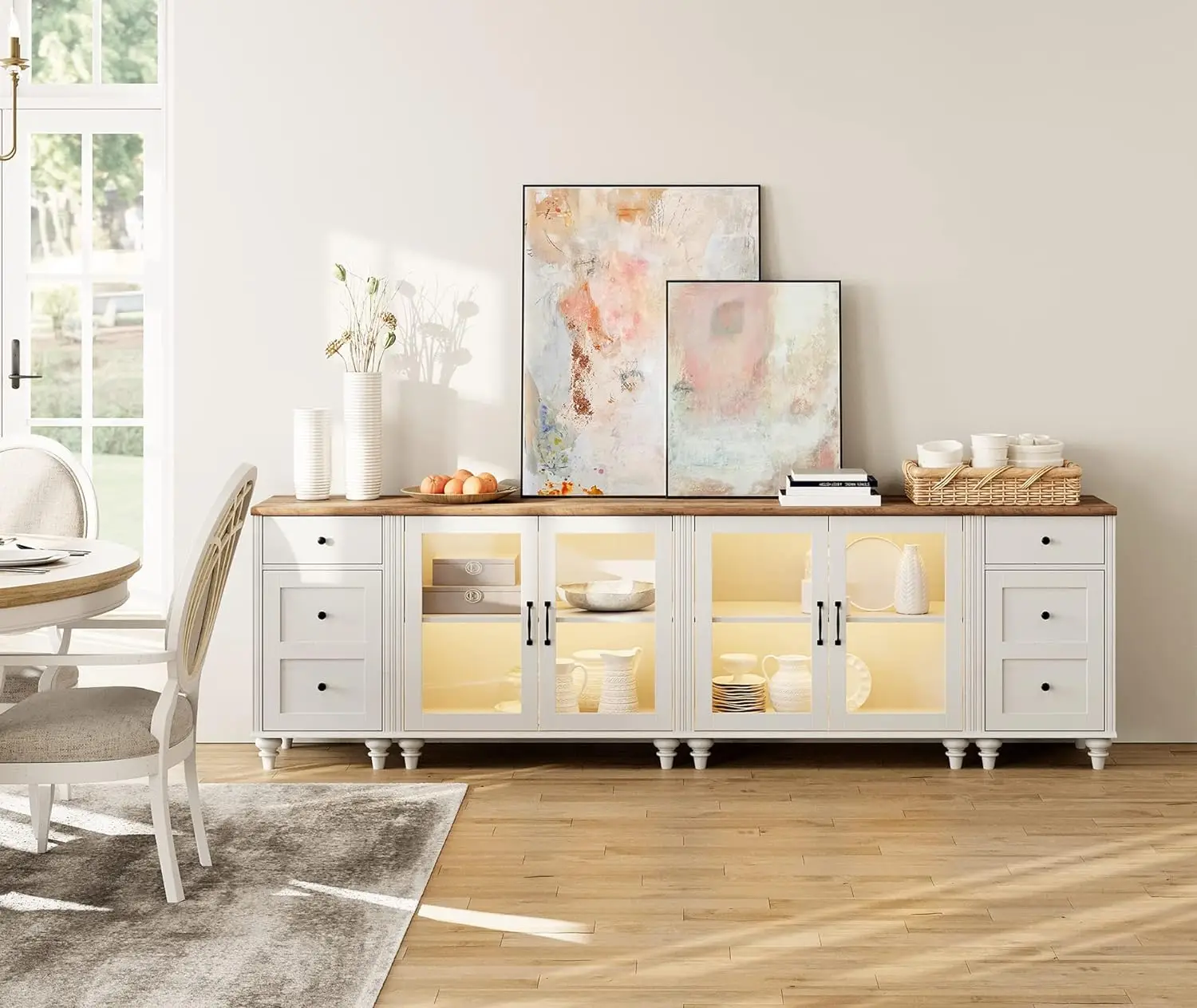 Brand WAMPAT Color Off White Recommended Uses For Product Side Table, Entertainment Center, Kitchen Buffet, Console Table Product Dimensions 15"D x 100"W x 30"H Special Feature Adjustable About this merchandise 【4-in-1 Multipurpose Sideboard】The 4-in-1 wide buffet table can be used individually as two glass shelves and two finish tables In addition to kitchen buffet cabinet, it can be used as entertainment center, console table, etc Dimension of Glass Cabinet: 33"×15"×30"(L×W×H) Dimension of Side Table: 16"×15"×30"(L×W×H) They are despatched separately in 3 packages, so you may well obtain them at various occasions 【Elegant Stylish Appearance】Featuring off white distressed wooden surface and mid century style, the kitchen cabinet is a perfect choice to add a dash of top-end and stylish allure in your room with curved edges can prevent unintentional injuries, especially for households with children, to avoid your kids fiddling with bumps gourd shaped leg design, give your interior ornament a new look! 【Adjustable Shelf & Glass Door】Designed with peak adjustable shelf, it's essential to handle the cupboard space in keeping with the thing size It maximizes the accessible area of the room whereas offering useful storage Additionally, the clear tempered glass door of the buffet sideboard make it easy for you in finding goods you wish 【Charging Function with USB Ports】One of those two finish tables is designed with charging station, which is arranged with 2 normal AC outlets and a couple of USB ports You may price cellular phone, desk lamp and different machine conveniently Power cable length: 6 toes 【Stable Frame & Use-friendly Detail】Combining fantastic materials with exquisite craftsmanship, this espresso bar cupboard is solid sufficient to carry diverse sorts of daily essentials and offer long lasting utilizing satisfaction It needs to be said that tender metal slides make the drawers easy to drag out Weight Capacity of Glass Cabinet: 100 lbs Capacity of End Table: a hundred lbs 【Quick Assembly & Easy Cleaning】The off white buffet cupboard is effortless to collect with detailed instruction And its comfortable waterproof floor is convenient to wash with a gentle damp cloth If you've any questions, please be at liberty to touch us, we can attempt our best to supply professional provider