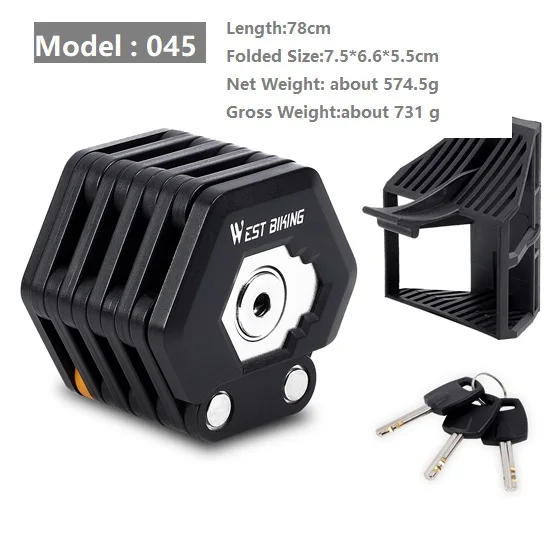 087-Alloy Steel Folding Lock Brand : WEST BIKING Material : ABS+59 cylinder+alloy steel+zinc alloy Size : Unfolded 85cm, Folded 12*6*4 Weight : 645 g Applicable : bicycles, e-bike, motorcycles, gates, and many others Features : Folding and portable, excessive strength, key release 098-Bike Folding Password Lock Brand : WEST BIKING Material : ALLOY+ABS Length : About seventy eight cm Color : Black Weight : About 587 g Suitable : Bicycle, Motorcycle, Electric Bike and so on Features : Foldable, Mini Portable, Sturdy and Durable,Safe and Anti-theft, out there in wet 067-Folding Lock Weight : 701g Color : Black Lock Cover Material : Zinc Alloy+Alloy Steel Material : Zinc Alloy+Alloy Steel+ABS Plastic +PA6 Alastic+59 Copper 045-Foldable Lock Length:78cm Folded Size:7*6*5 Net Weight: about 574 Gross Weight:about 731 g Material:â‘ Lock: Internal alloy steel; Rivet chrome steel 304 â‘¡Bracket: ABS environmentally plastic