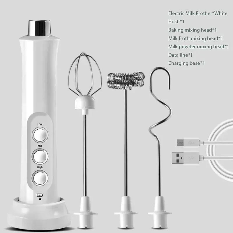 Description: Product Name: New Coffee Milk Frother Egg Whisk Material: Stainless Steel Features: three In 1 Built-in Battery: 1200 mAh Speed: 3500RPm & 8500RPM & 13500RPM Charging: Full----Green Light/Charging----Red Light; Optional Color: Black/White Power: 2 Current: zero Voltage: four Electric Milk Frother color:White/black Packing List: 1 *1 2 blending head*1 three froth blending head*1 4 powder blending head*1 five line*1 6 base*1