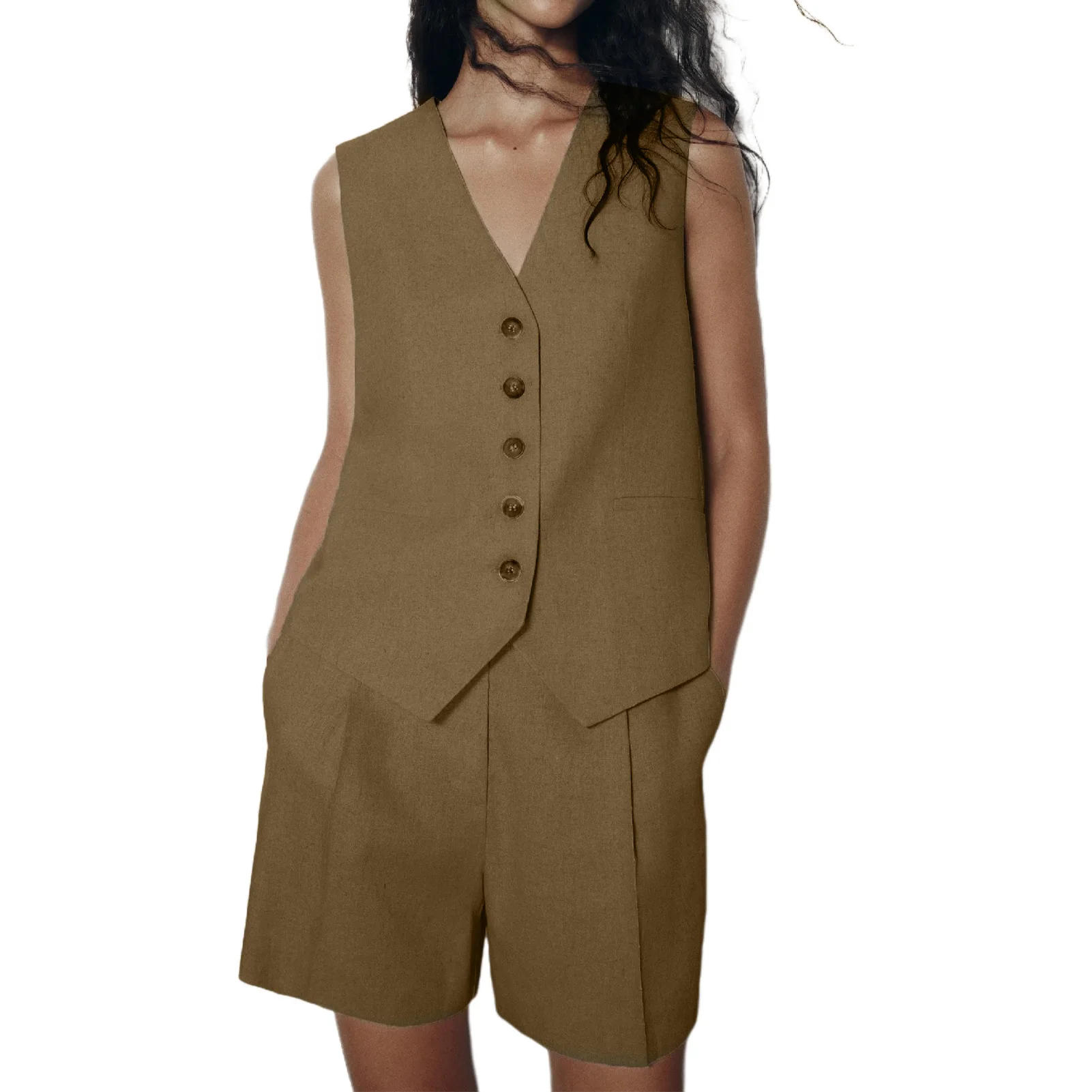 Women 2 Piece Fashion Outfit Comfy Button Vest & High Waist Short Cozy Solid Color Slim Fit Daily Commuting Suit