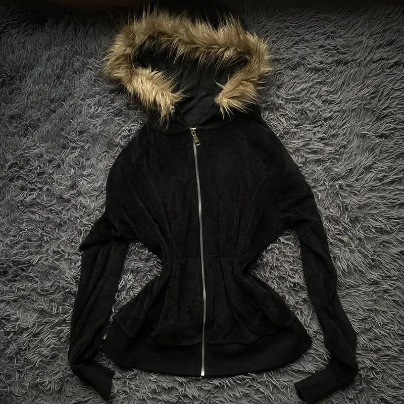 Women Dark Faux Fur Collar Y2K Zip up hoodie Casual Rock Gothic Jacket Vintage Punk Harajuku Zipper Hoodie sweatshirt Streetwear