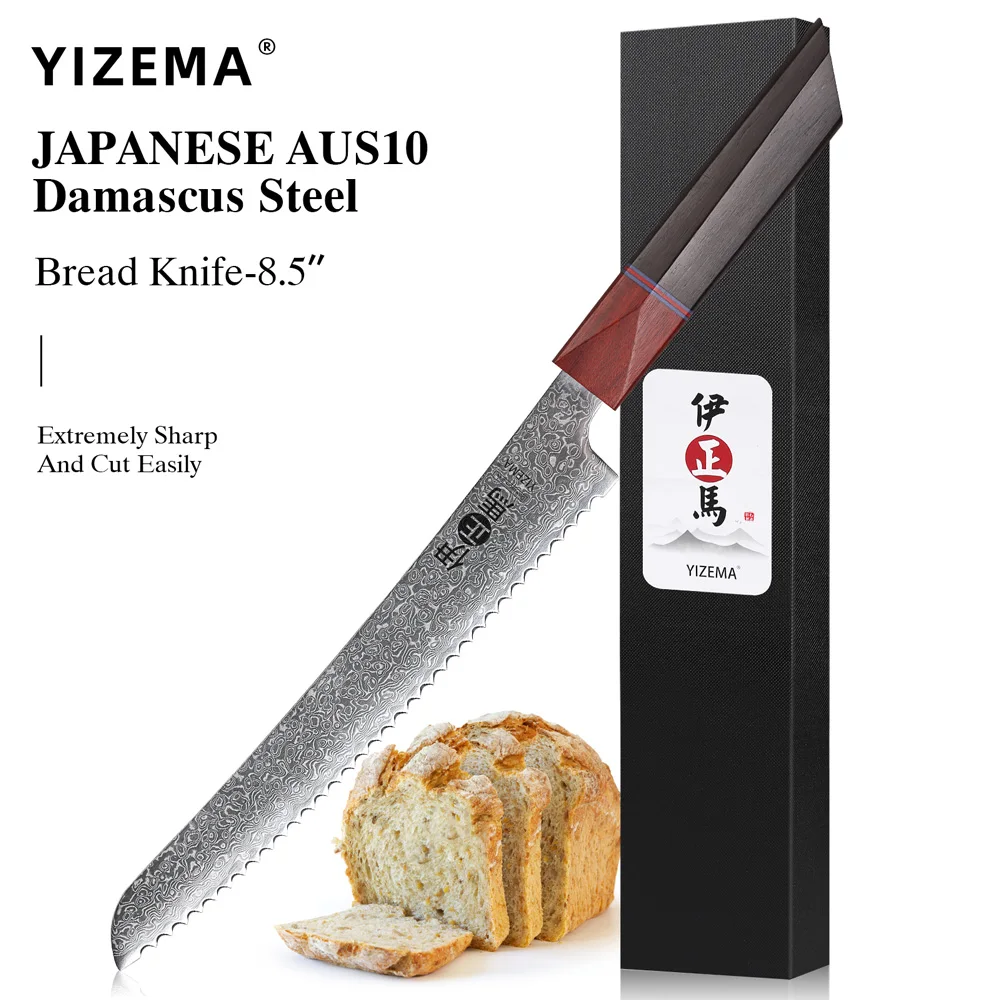 YIZEMA 8" Professional Serrated Bread Knife Handmade Damascus Steel Kitchen Japanese Chef Knives Cut Cheese Cake Toast Tools Product Description : Product Name : 8 inch Bread Knife Blade Material : 67 Layer Damascus Steel Handle Material : Ebony and Red Sanalwood Handle Steel core : AUS-10 metallic core Steel core hardness: 60±2HRC Angle: 15 degrees consistent with side Knife length: 365mm Knife blade size : 220mm Handle length: 145mm Thickness: About 2 Width: 34mm Weight: About 130g Package included: kitchen knife *1PC Surface technology: polished, excessive grade Exterior features: sharp and durable, super rustproof, optical sharpness Rating: cutting pressure rating International common Packaging: present box NOTE:Suitable for each day kitchen cooking, chopping meat, slices, greens melons etc(don&;t use it cut the bone or other not easy food)