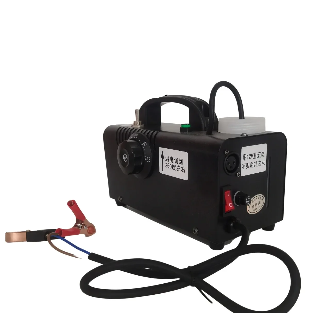 It doesn't contain a battery, only a 12V fog machine, the 12V fog mechanical device is a 12V lithium battery, 12V battery, 12V lead-acid battery would be used, the battery means is greater than 16A, the larger the number of amps, the longer the use time, the fog mechanical device is 200W, the smoke mechanical device has a considerable amount of smoke, heating for 5-8 minutes, it can be sprayed for 40 seconds, and it should be persistently preheated after spraying, and the quality is steady