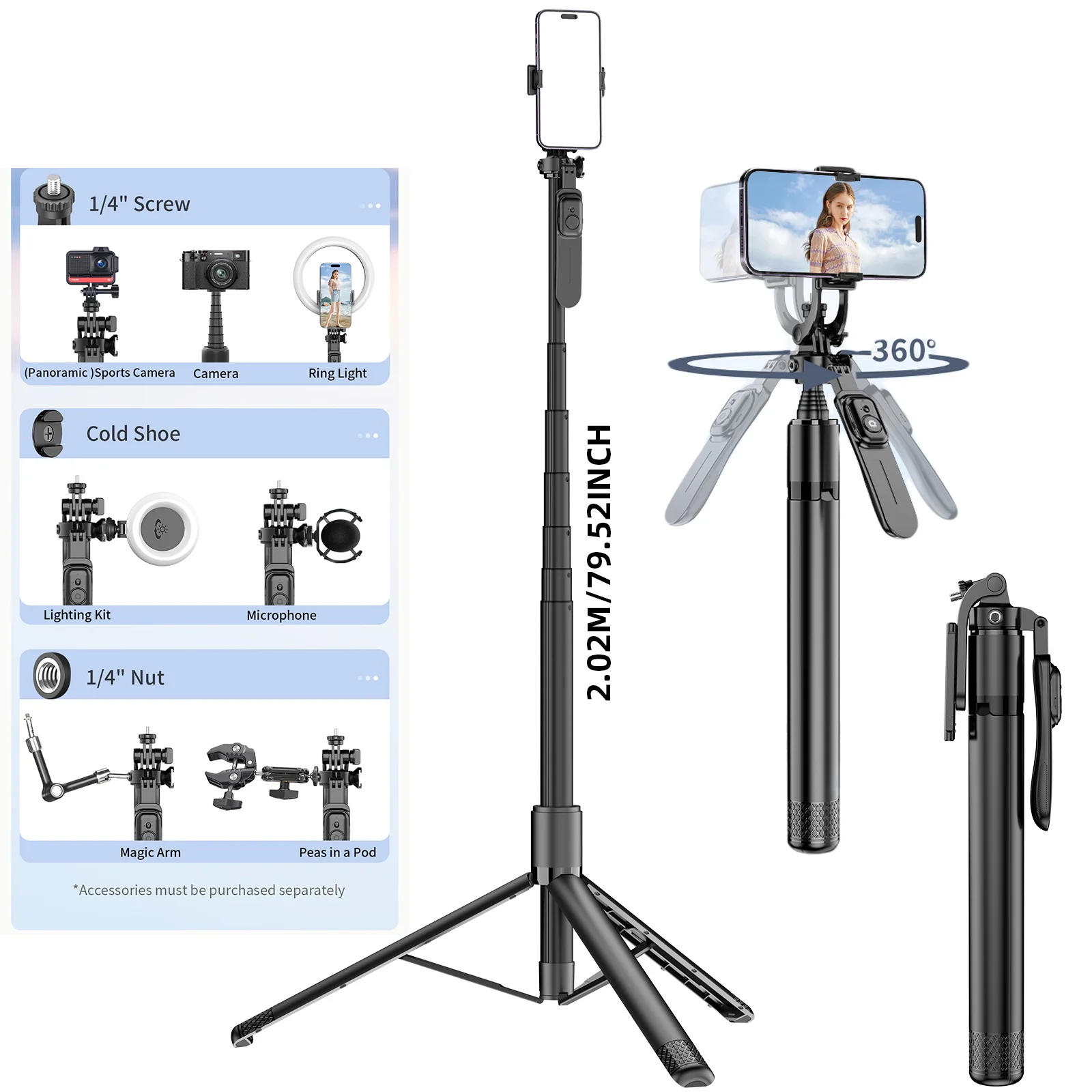 Product Feature: Balanced-handle, 360°panoramic shooting,reinforced and secure aluminum rod,extensive expansion,compatible with assorted accessories (1/4 screw, 1/4 nut, bloodless shoe port) This selfie stick tripod comes with a wi-fi remote,allowing you to listing videos or take pictures more very easily It contains a completely expandable hand held selfie stick handle with integrated collapsible legs that allow it to double as a stand-alone tripod when opened Selfie stick tripod adopts a bolstered design with three integrated holders and three non-slip silicone toes pads,which is extra stable after unfolding and isn't always clean to shake( Note: In the tripod mode,the phone should be positioned within the middle of the sliding track,which is in keeping with the middle of gravity of the tripod to avoid tipping) The cell phone holder can help phones with width of two (6),it matches most ios/Android phones,adjustable attitude and rotatable cellphone holder Wireless handheld remote control design, with common selfie stick operate when installed, it's extra handy to take selfies when removed, and group pictures will now not be ignored The tripod for telephone has a integrated wireless remote control, helps taking pictures inside 10m, is compatible with IOS/Android, soon realizes pairing, and the operation is very simple The remote control is embedded removable design, simple to take out, it'll also be mounted on a tripod leg when it is not had to forestall loss With 1/4&;&; screw, bloodless shoe, 1/4&;&; nut, phone holder, fit the fill light, microphone, ,mechanical arm, lights kit, camera and so forth Product Description: Material: ABS + Aluminum Alloy Product Size: 81 x forty nine x 365--2020 mm Tripod Open to Maximum Height: 2020mm(79) Support Phone size: 65-92mm Weight: 445g Package Included: 1 X Selfie Stick 1 X Wireless Remote Controller 1 X User handbook 1 X Colorful Box Note: All product outward appearance, the dimensions coloration take the fabric object as, the image solely supply the reference We provide you with the best product and repair Please don't remark or open disputes when you bump into problems, please let us know, and we are able to clear up the issue ASAP