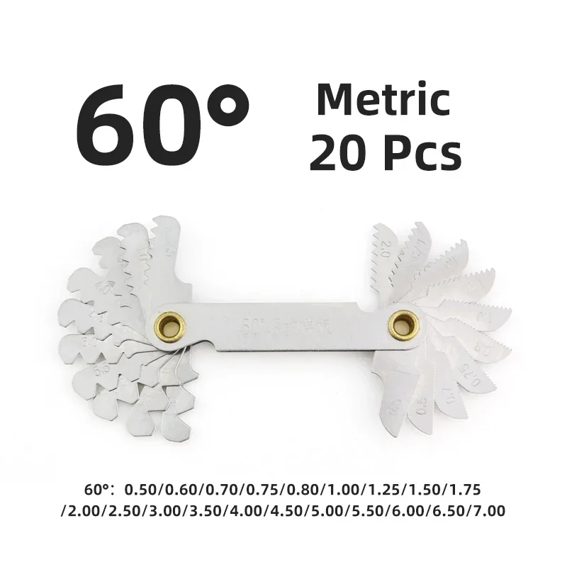 Product Parameters Name: Thread Pattern/Thread Plug Gauge Material: Carbon Steel Specifications: 60 Degree Metric / 55 Degree Imperial Number Of Pieces: 20 Pcs Purpose: Used To Check The Pitch Of The Thread, The Pitch Of Each Piece Is Different Pitch: 60°:0/0/0/0/0/1/1/1/1/2/2/3/3/4/4/5/5/6/6/7 55°:4/4/5/6/7/8/9/10/11/12/13/14/16/18/19/20/22/24/28/32/48