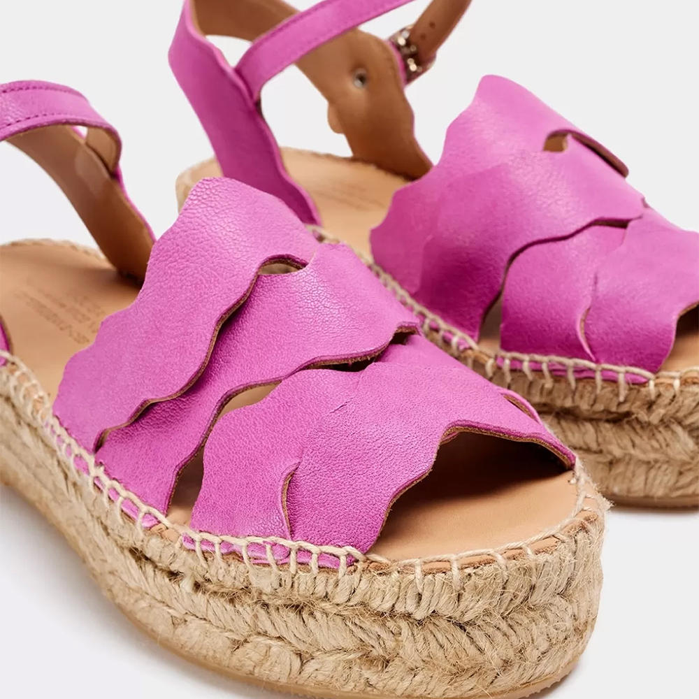 Alafia is a sandal with scalloped, interlaced straps on the vamp and a metal buckle fastening at the heel. Sheepskin leather uppers. Leather lining. The insole is cushioned with foam and lined with natural cowhide leather for better breathability. The sole is made of a double jute braid, a small wedge for increased comfort, and a non-slip rubber outsole. Total height of 5 cm.