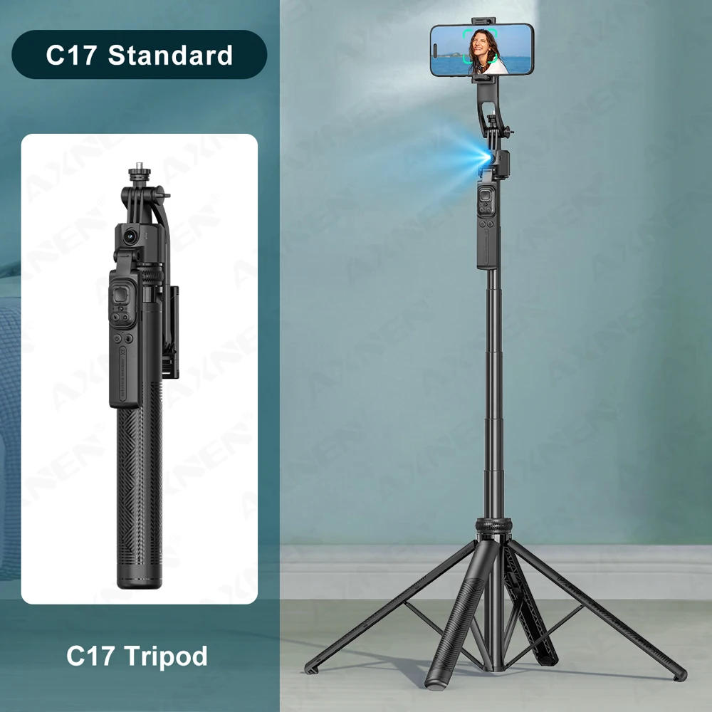 AXNEN C17 Selfie Stick Tripod All-in-one AI tracking tripod with detachable cellphone holder, 360° rotation, secure quadpod, balancing handle; Multi-function handheld remote control for TikTok, well suited with Android and iOS; Great for DSLR cameras, cellular phones, etc Option Detail: &;&;C17 Standard&;&;: C17 Tripod &;&;C17 0ption 2&;&;: C17 Tripod+2pcs Mini Light &;&;C17 0ption 3&;&;: C17 Tripod+D07 Fill Light &;&;C17 0ption 4&;&;: C17 Tripod+Wireless Microphone for Type-C Port Phone(Not for Action cameras) &;&;C17 0ption 5&;&;: C17 Tripod+2pcs Mini Light+Wireless Microphone for Type-C Port Phone(Not for Action cameras) &;&;C17 0ption 6&;&;: C17 Tripod+D07 Fill Light+Wireless Microphone for Type-C Port Phone(Not for Action cameras) &;&;C17 0ption 7&;&;: C17 Tripod+Wireless Microphone for iPhone Lightning Phone (Not for Action cameras) &;&;C17 0ption 8&;&;: C17 Tripod+2pcs Mini Light+Wireless Microphone for iPhone Lightning Phone (Not for Action cameras) &;&;C17 0ption 9&;&;: C17 Tripod+D07 Fill Light+Wireless Microphone for iPhone Lightning Phone (Not for Action cameras) Why want AXNEN C17 Selfie Stick Tripod? 1 AI face tracking, AI chip, smart lens, gesture control 2 Stable quadrapod,Structural help is stable and doesn't sway 3 Adjustable quadrapod,Adaptation to a wide range of venues 4 Balanced handle, 360° panoramic capturing 5 Detachable phone mount,Can be used as a mobile phone holder 6 1/4 interface compatibility is broad (can be matched with fill light, double fill light, motion camera, electronic camera, etc) 7 TIKTOK Remote control eight Both for Android and iOS fit 9 Regardless of any after-sales issues, please prioritize contacting our customer service for reply or decision Don&;t worry, AXNEN reliable shop will present you with considerate customer support Whether it&;s product usage or quality issues, we can do our best to solve them for you! Thank you to your understanding! 10 Our products are all real AXNEN merchandise If you've any questions about the use of any product, please consult AXNEN Official Store Appearance Parameter Product size:88x44x360~1635mm colour:black Packing size:360 x 88 x 44mm Hardware Parameters Materials: ABS+Aluminum Alloy Phone size: 65-95mm Tripod open to maximum height: 1635mm Hardware Parameters (Selfie) Bluetooth version: Bluetooth five Transmission Frequency: 2 Working Voltage: 3V Bluetooth distance: 10M Battery: CR2032(CAN CHANGE) For Android system: for Android eight or above For iOS system: for iOS thirteen or above Electrical Parameters Battery Capacity: 800mAh Charging Current: 1 Working Current: 1-0mA~575mA Work Time: 1 hours in spin mode Cconsumption Power: zero Rated Voltage: three Best Distance: 0 meters (face recognition) zero meters (gesture recognition) Tracking Mode: face recognition Working Principle: Camera Gesture Operation: OK gesture starts/switches target Palm pause Al Face Tracking Gimbal Quadrapod Features:1 Al Tracking2 Balance Handle3 Quadrapod4 Detachable5 Multi-function Remote6 Aluminium Rod7 360° Rotation8 All-In-One Al Tracking Follows Wherever You Go Capture each exquisite second of you Just Turn lt On Easy To Use No APP required,compatible with different utility Lock you in even if you&;re coated A quick cover-up won&;t lose music of you Rear Shotsare Clearer! Both entrance and again can persist with you Large Quadrapod More Stable Umbrella keel constitution design for extra stable support Adjustable Quadrapod Works properly in small locations and is acceptable for quite a lot of venues Multi-functional Video Remote You can take selfies or swipe short movies Steady Shot With the balancing handle,the lens would be transported step by step 1/64in Easy Group Photo With the balancing handle,the lens can be transported steadily Detachable Design Quick disassembly and straightforward to apply 1/4" Interface Multi-Compatible Can be used with phone, minicamera, fill light, etc Multi-angle Adjustment Meet a variety of capturing Optional Mini Fill Light 3 Colors of light, every single colour has 2 brightness There are a complete of 6 lighting effects be used forward or backward Optional D07 Fill Light We promote optional D07 fill light, which with 3 color and three brightness for each coloration All-in-one Portable Easily bagged and ready to shoot,it&;s no longer a trouble to take him out with you Multi-Scenario Ready to shoot for any event Parameters Material: ABS + Aluminium Rod Clip Distance: 65-95mm/2 Size: 360x88x44mm14 Weight: 620g/1 Battery: CR2032(Replaceable) Compatibility: for Android8+/iOS13+ Optimum Distance: 1-4m/39