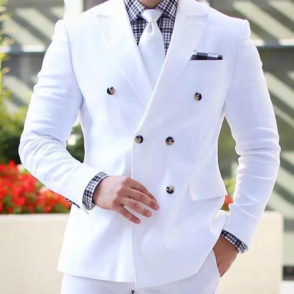 Elegant Double Breasted White Wedding Suits for Men Formal Peak Lapel Chic Blazer Groom Custom Outfits 2 Piece Jacket Pants Set