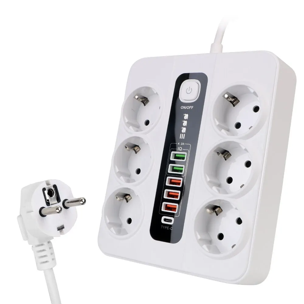 • 3000W Power Capacity :This extension socket with safety switch energy strip boasts a high power capability of 3000W, guaranteeing efficient and dependable functionality to your electronic instruments • 2m Cable Length :With a cable length of 2m, this energy strip provides adequate reach, making it splendid to be used in places of work or home places with restricted space • USB Type C Ports :Equipped with USB Type C ports, this energy strip provides quick and flexible charging recommendations for your devices, enhancing your productiveness and convenience • Overload Protection :The built-in overload defense function ensures the safety of your instruments by robotically removing energy in case of overload, preventing potential hazards • Wall Mounted Installation :Designed for wall fixed installation, this power strip saves area and keeps your area tidy, making it an ideal addition to any room • Plastic Material :Made from durable plastic material, this energy strip is designed to withstand each day use while final light-weight and conveyable Features: 100% brand new and excessive quality, with bold oxygen-free copper twine With slot and rubber on the back, so it is lockable and antiwear 45° area saving: creating room for different plugs to proportion the outlet High temperature flame retardant materia: The overall use of excessive flame retardant materials high temperature resistance is as much as 750 °C Mutiple variety charging interface: five excessive speed USB ports, 6 EU AC outletsand 1PD-20W extremely velocity USB Type C, ideal for controlling electronics With 2m extension cable, secure and satisfying the space between the movable equipment and the constant socket Suitable for many electronics, mobile phone, camera, computer, washing machine, strength bank, speaker, microwave oven, printer etc, to satisfy your desire 6 protections: overload, overcurrent, hightemperature, overvoltage, short-circuit and electrical shock protection With overload protection, the security switch, intelligently name the extra stable,output latest of usb, larger preserving the charging kit Specification: Material: Fireproof PC material Color: Black, White Rated current: 10A(MAX) Rated Power: 3000W Voltage: 100V-250V Response Time: < 1ns USB output: four (non-fast charge) QC 3 Output: 5V/3,9V/2A,12V/1 Plug: EU Plug Notes: For use with information tecnology package Do no longer disassemble, to forestall electrical shock! Use in a dry environment! Package Included: 1 x Power Strip