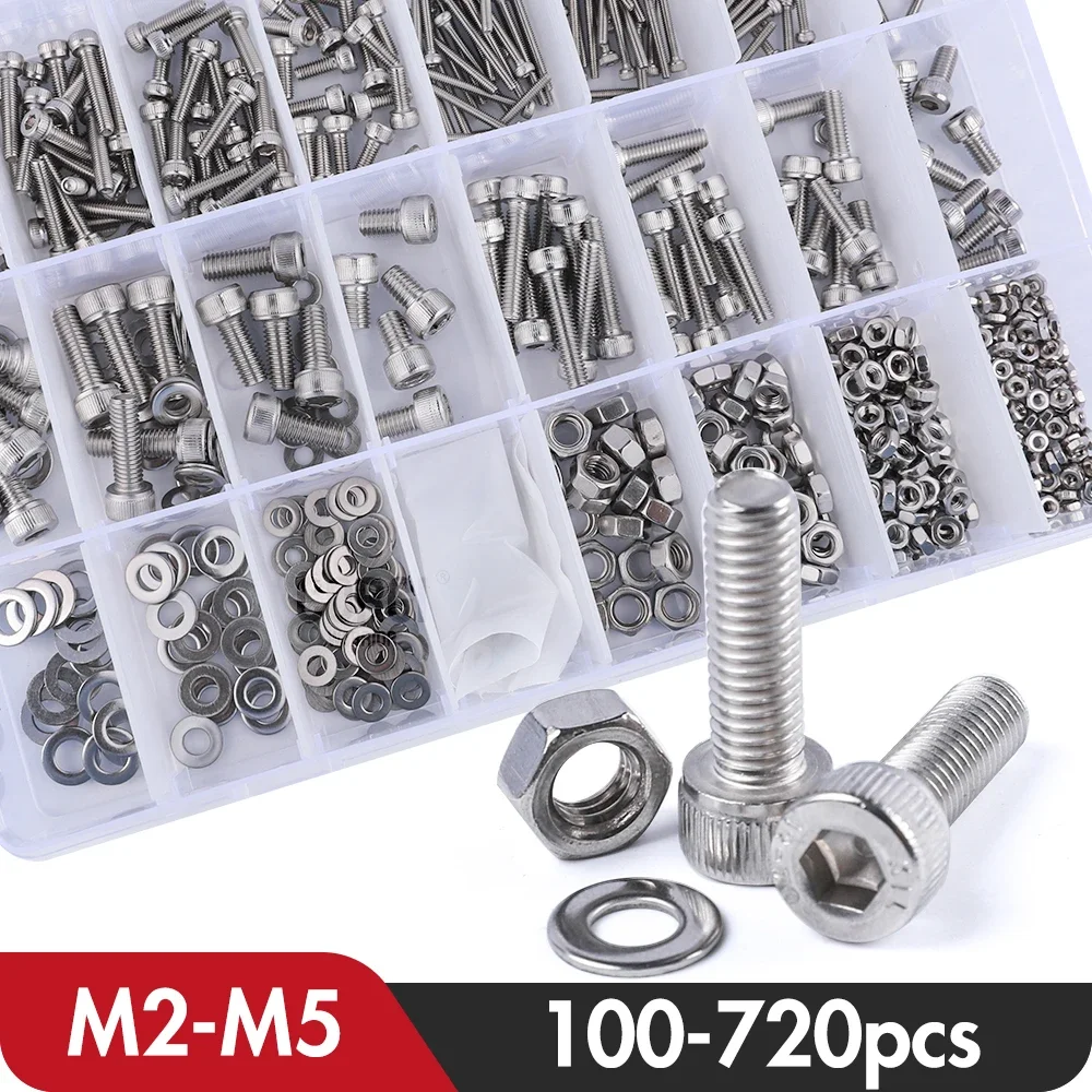 Hex Socket Head Cap Screws Assortment up to 720pcs M2 M2.5 M3 M4 M5 DIN912 Stainless Steel Metric Allen Bolts Nuts Kit with Case