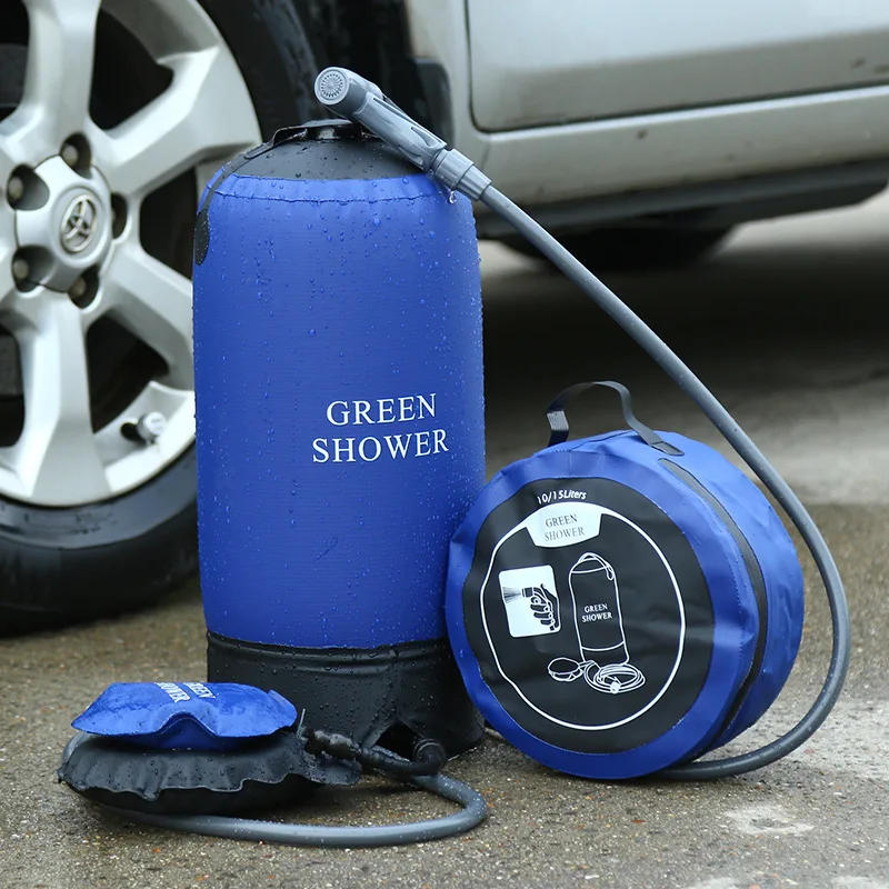 Camping Pressure shower Description Product name:Camp stress shower Fabric:PVC tarpaulin Size:20X46CM color:blue weight:860g capacity:12L