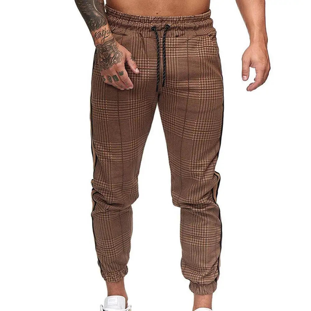 Pocket Long Pants Men Long Pants Drawstring Casual Stripe Plaid Print Pants Ankle-Tied Trousers
