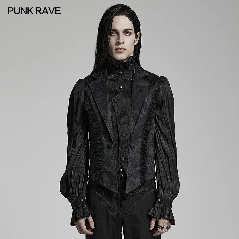 PUNK RAVE Men's Gothic Gorgeous Lace Decoration Asymmetric Lapel Waistcoat Unique Pointed Outline Elements Party Long Sleeve Top