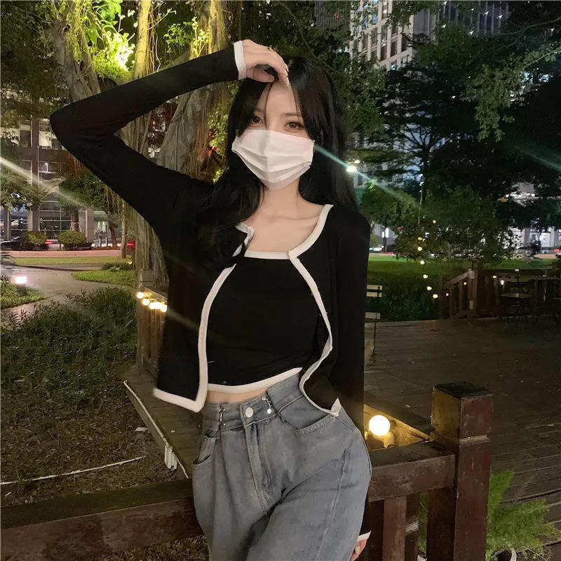 Sets Women 2 Pieces Long Sleeve Cardigans Cropped Tanks Patchwork Sexy Sweet All-match Party Cozy New Ulzzang Outfits Mujer Ins