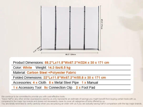VEVOR Room DividerLooking to create chic and purposeful spaces? VEVOR&;s indoor privateness display screen is for you! With different sizes and colors, it gives very best quality and contours waterproofing, solar shading, and sturdy construction to resist tipping Takes up less than 1 ㎡ when folded! Create the perfect space!When now not in use, our 4-panel room divider could be smoothly folded and stored, taking up less than 1㎡ of area room divider wall is designed with a snap connection method, making it smooth for one consumer to install it with basic instruments on your living room, workplace or as an ornamental detail in your home, our room divider display screen can be utilized to fulfill your needs folding privateness monitors are manufactured from advantageous 180g polyester PA cloth They not just provide you with a snug private space but also block out daylight and water & Details Create A Perfect Private Space: Our room divider is made from a hundred and eighty g polyester cloth with PA coating It offers privacy protection, is waterproof, and blocks the sun It creates a comfortable inner most area for you and is durable for long-term use Sturdy and Reliable Construction: Our 4-panel room divider is easy to gather with nine connector clips and a carbon steel metal body For added stability, we&;ve incorporated two metal bases This makes our partition sturdy and not easily knocked over by pets or kids Flexible & Folding Design: It elements an open length of 88"W x 11"D x 67"H It would be divided in to 1-4 panels to satisfy every kind of scenes by way of putting in or cutting off plastic connectors folded, it measures 22"W x 11"D x 67"H, taking up less than 1 sq. meter for space-saving storage Hassle-free Assembly: VEVOR folding privacy monitors can be assembled with snap connectors, making it smooth for one user to gather by means of following the directions in the guide Please note that due to the material material, we suggest ironing the material earlier than assembly If you've any questions, don&;t hesitate to touch us Perfect for Any Room: Our room divider panel can be used in different settings equivalent to bedrooms, living rooms, offices, and hospitals to create private partition areas Additionally, it will serve as home decoration for exhibiting kin photograph walls and extra Let your mind's eye run wild and explore the possibilities!