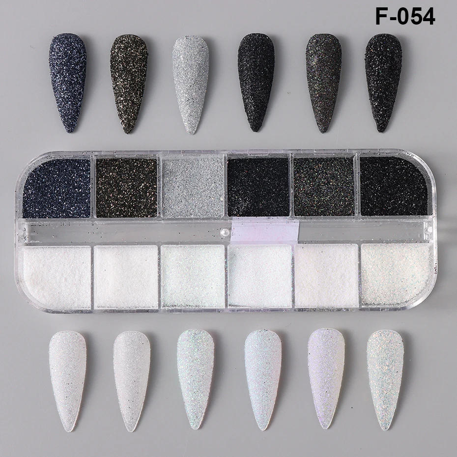 PRODUCT FEATURE: Item:12 Grids White Black Nail Glitter Powder Colors: Black/White /Silver/Blue Details:Shiny Powder/Pigment/Flakes Effect:Iridescent /Sugar Effect for Nails Designs: Elegant Wedding Nail Design/Shiny Summer Sand Sugar Nail Art/DIY Acrylic Flowers/Snow /Sweater/French Manicure Decoration Feature: Gel Polish Manicure Accessories DIY Tools PRODUCT PICTURE: