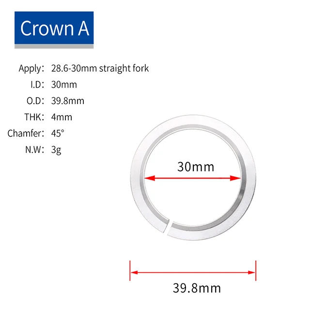 Bicycle Fork Crown Headset Spacer For 1 Inch tapered fork/ 1 1/8 directly fork Color:Black Inner Diameter: 39/29 Angle:45degree Thickness:5mm Weight: C : four /D : 13 Application: 42-52mm hidden/large-caliber exterior headset/44-55/56mm headset