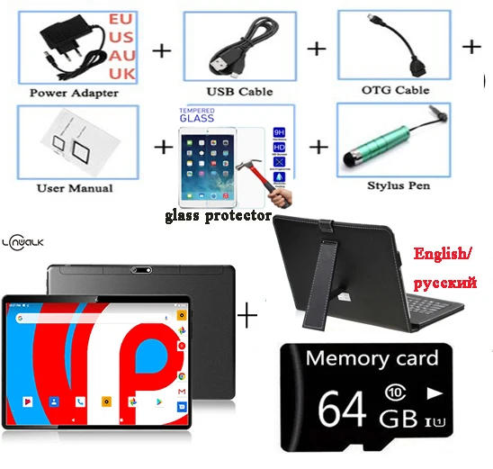 10 inch Quad Core 3G 4G FDD LTE Phone Call TABLET PC !!!Metal Design!2.5D G+G Tempered Scratch Resistance Screen 2GB RAM 32GB ROM + Android 9.0 OS + MTK6580 Quad Core + Dual Cameras + 1280*800 IPS Screen + OTG + WIFI + Bluetooth !!! Support Band below: Highlights: 1: MTK6580 Quad-Core, ARM Cortex A7@ 1.6—2.0GHz; 2:2G Bytes LPDDR3 3: Built-in 32G Bytes NAND Flash storage 4: 10.1 inch IPS HD 1280*800 Resolution, 2.5D G+G Tempered Scratch Resistance Screen Operation System Android 9.0 Screen 10.1 inch 5 Point Capacitive Touch Screen, 2.5D G+G Tempered Scratch Resistance Screen Resolution 1280*800 Pixel CPU MT6580 RAM 2GB Nand Flash 32GB Webcam Front 2.0MP Back 8.0MP Cameras Wireless Wifi 802.11 b/g 2G GSM 850/900/1800/1900 MHz 3G WCDMA 2100 MHz GPS Yes,A-GPS Bluetooth Yes G-sensor Support Power Battery 6000mAh,Video more than 4 Hours,Standby time more than 72hours Working Time Up to 4-6 Hours Power Device Adapter Input 100-240V 50/60Hz output 5V-2A Device Specification Color Black, Gold, Silver , Blue Dimensions 241.2x150x11.7mm Net Weight 0.6kg Software Support Office Support MS Office Word, PPT, Excel Email Email, POP3/SMTP/IMAP4 Others QQ ,skype... Multi-Media Video AVI, MP4, FLV, 3GP, MKV, WMV etc. Audio MP3,WMA,WAV,APE,FLAC,AAC,OGG etc. Picture JPG/BMP/PNG/GIF. E-Book PDF, TXT etc. Port 1 x Micro USB Slot 1 x TF Card Slot 2 x SIM Card Slot 1 x Earphone Jack Package 1 x Tablet PC 1 x User's Manual 1 x Charger Weight 1.2 kg Leather Case and Keyboard case(Russian and Eglish QWERT )