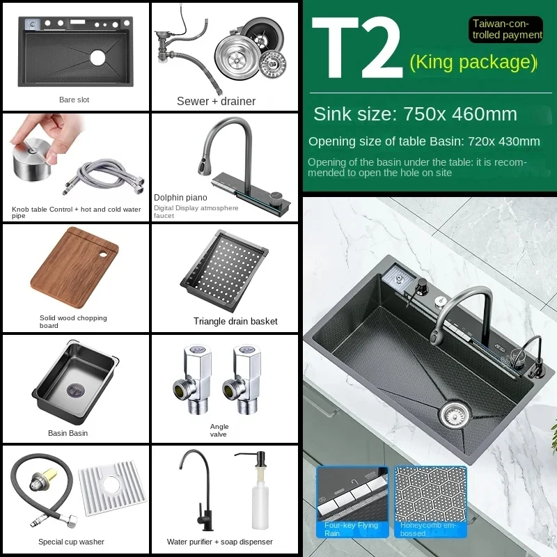 304 Stainless Steel Waterfall Kitchen Sink Large Single Slot Integrated Digital Display Faucet Set Soap Dispenser Cup Washer