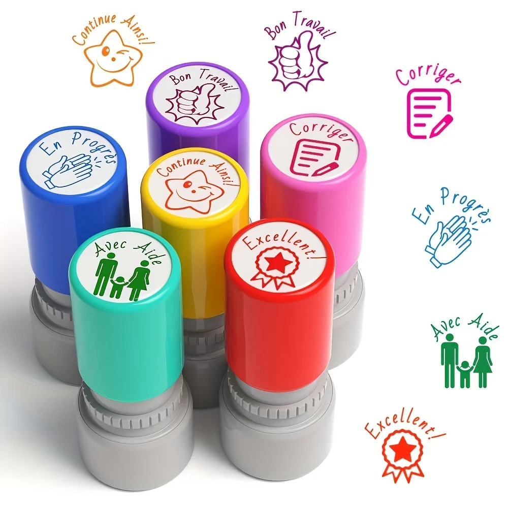 6pcs Color Stamps With Tray, Classroom Grading Seal Homework Signature Teacher Seal