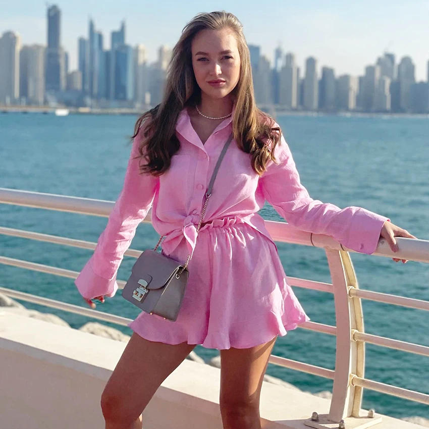 Bclout Linen Shorts Suit Women Summer Long Sleeve Shirts Orange Elastic Waist Ruffle Shorts Sets 2 Pieces Woman Outfits Vacation