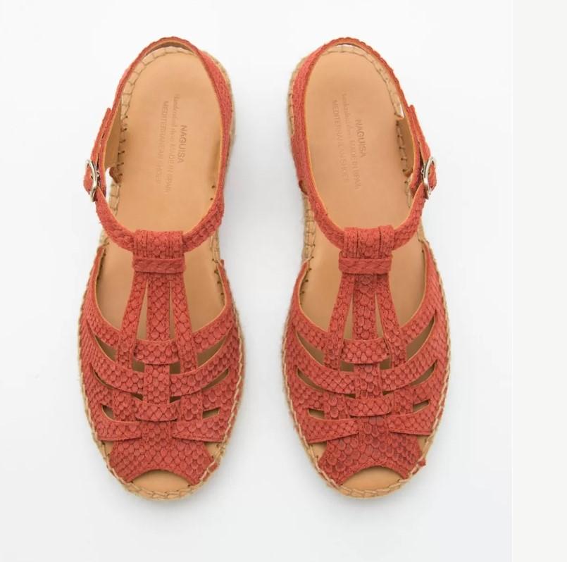 BEMOL BRICK Bemol, a Naguisa classic, is a strappy caged sandal with an adjustable ankle strap. Engraved split leather uppers. Leather lining. The insole is cushioned with foam and lined with natural cowhide leather for better breathability. The sole features a jute double braid, a small wedge for improved comfort, and a non-slip rubber outsole. Total height of 5 cm.