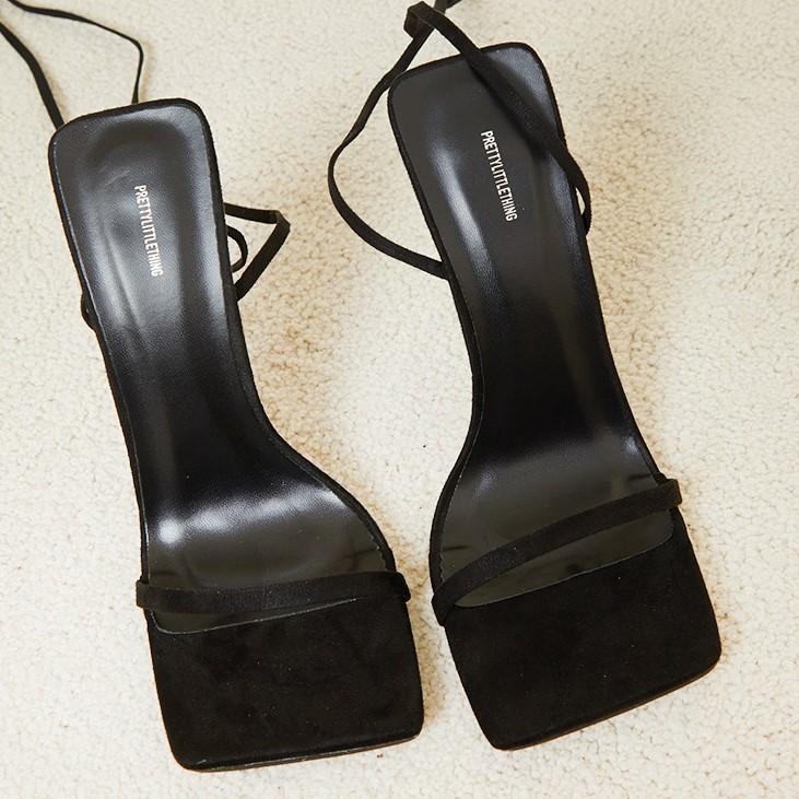 Black Faux Suede Square Toe Barely There Lace Up High Heeled Sandals