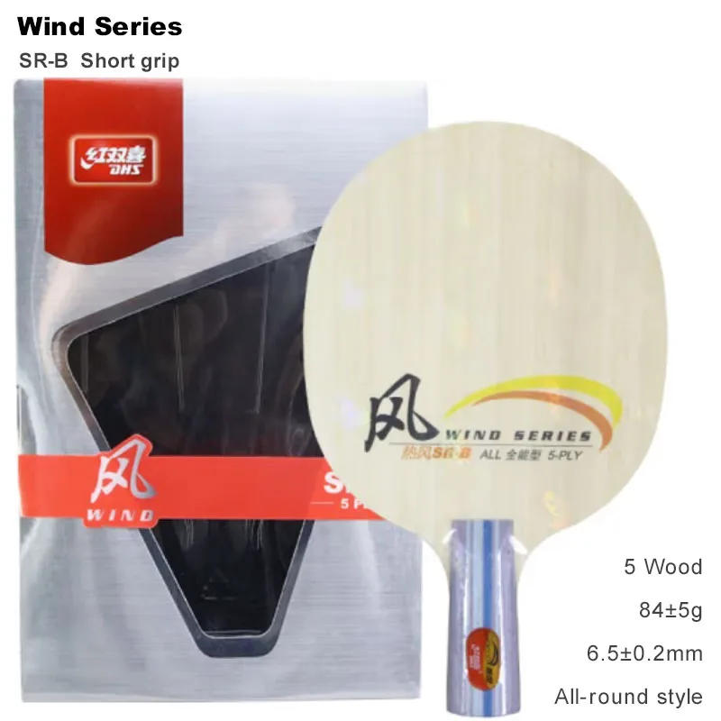 DHS Wind Series Blade Wind CW Brand: DHS Product: Table tennis blade Model: CW-C, CW-D Style: Attack Plies: 5 wood 2 carbon Weight: 98g to 102g Thickness: 6 Wind SR Brand: DHS Product: Ping pong blade Model: SR-A, SR-B Style: All-round Plies: five wooden Weight: 84g to 87g Thickness: 6