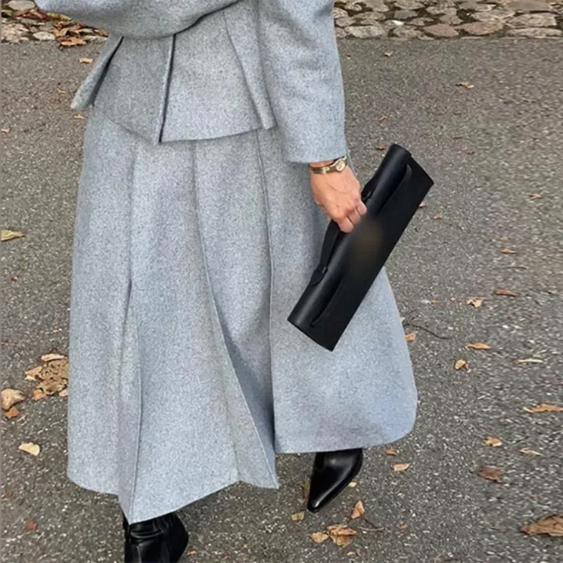 Elegant Woolen Coat Skirts Set Women Grey Lapel Hidden Buckle Blazers Pleated Skirt 2024 Autumn Winter New Lady Office Outfits