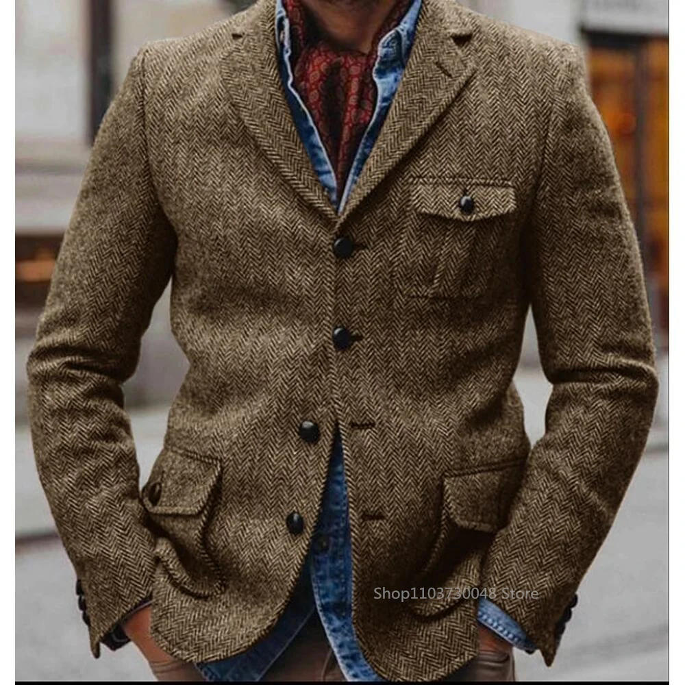 Herringbone Men's Jacket Single Breasted Elegant Casual Slim Stage Suit Jackets Suite for Man New in Suits and Blazers Male Coat