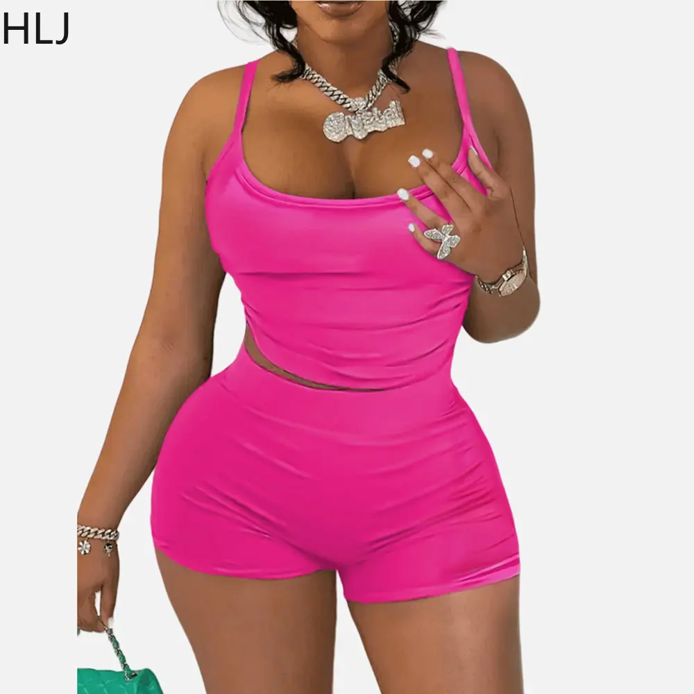 HLJ Sexy Bodycon Shorts Sets Women Strap Sleeveless Crop Top + Shorts Two Piece Tracksuits Female Solid Sporty 2pcs Outfits 2023