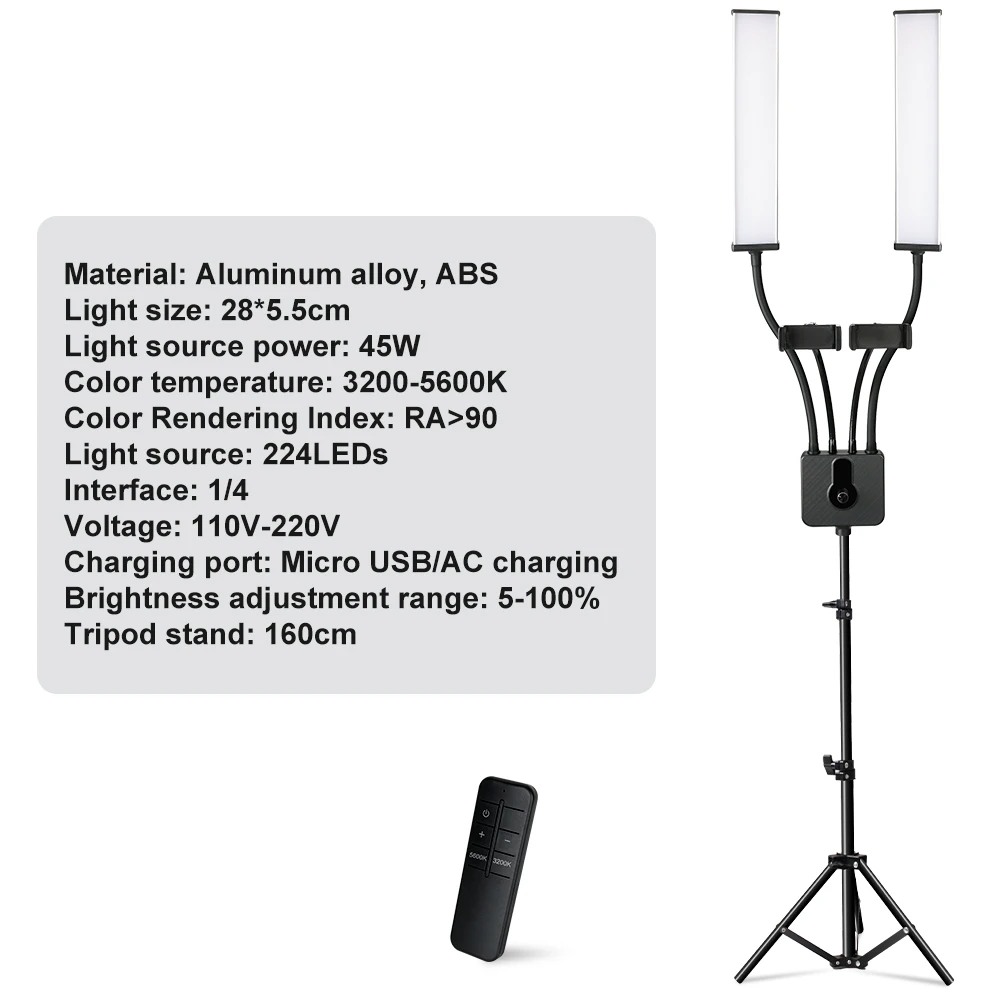 Usage: 1 Take the dual-arm gentle out of the box, insert the adapter DC head into the console DC interface, turn the knob of the fixed bracket, set up it on the drop bracket or desktop bracket, and fix the adapter to the AC power; 2 Press the ability change knob, turn on the flexibility switch, the reveal shows brightness P, that is, it enters the brightness adjustment mode Brightness could be adjusted from 5% to 100%, clockwise will increase the brightness, counterclockwise decreases the brightness; three In the power-on state, press the swap knob, the show will enter the colour temperature adjustment mode when the colour temperature cost is displayed, and the color temperature would be adjusted from 3200K to 5600K The clockwise course is increased, the counterclockwise path is decreased, and the exchange interval is 100; 4 Press the knob at the beginning to change between the brightness adjustment mode and the brightness adjustment mode at will; 5 Press and hold the ability change knob for two seconds, when the exhibit displays OFF, the gadget has been grew to become off, and the flexibility could be disconnected at this time; 6 The left and right facets of the lamp physique could be rotated, and the path can be adjusted to the facet Specification: Power: 15V, 4A LED light complete power: 45W Color rendering index: Ra: ninety Color temperature: 3200K-5600K Use voltage: AC 100V-240VLED Number of lights: 112 white light, 112 heat light stepless dimming, display digital demonstrate and USB charging operate (5V, 2A interface output) Dual energy delivery mode: DC AC power supply or NP-F970 pictures battery strength supply (please note: do not supply energy at the similar time) Package: 1 Lamp body 2 Hose three Console four Display five brackets 6 Hose Handpiece Clip 7 Power switch/color temperature/dimming knob 8 charging interface 9 DC energy inlet 10 Fixed bracket knob 11 Power adapter (15V, 4A)
