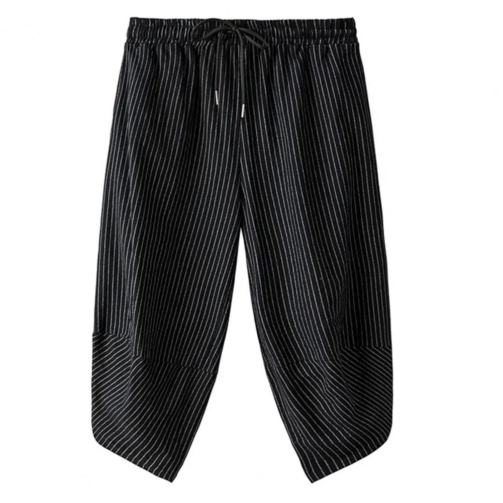 Men Summer Cropped Pants Elastic Drawstring Waist Carrot Pants Vertical Striped Print Harem Pants Streetwear
