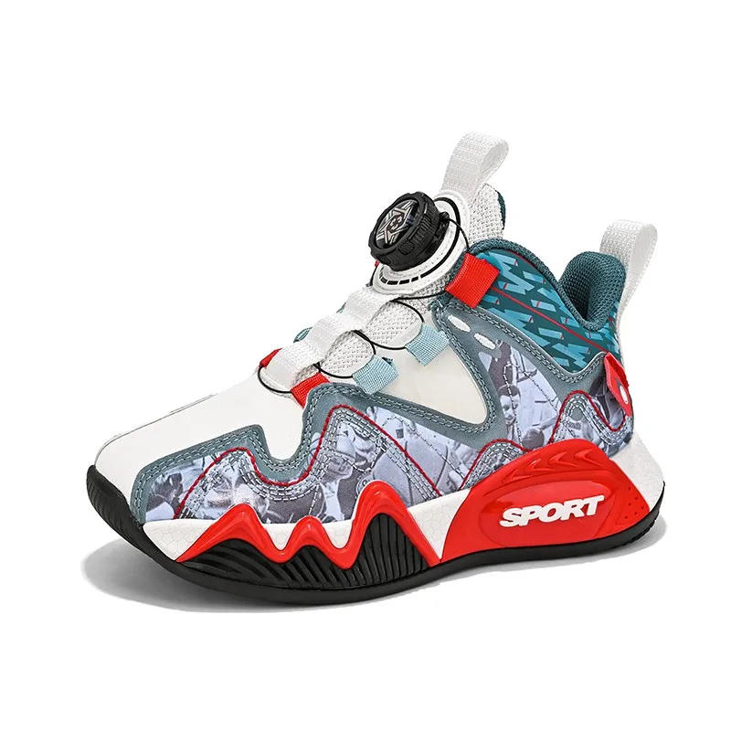 New children's shoes Boys rotating button sneakers leather non-slip large children's combat boots children's basketball shoes