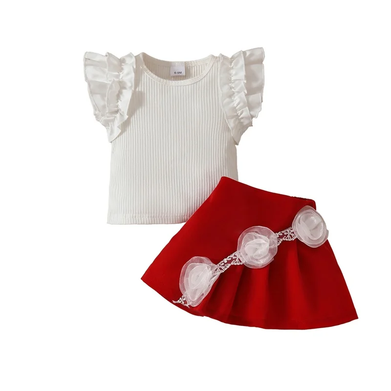 Toddler Baby Girl Skirt Set Flying Sleeve Ribbed Tops 3D Flower Ruffle Skirt Summer Clothes 2 Piece Outfit