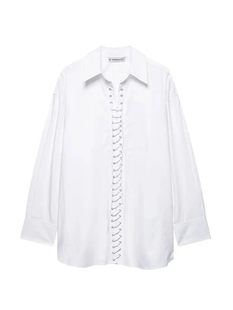 TRAFZA Spring Women's Long Sleeves Hollow Lapel Lace Decorate White Blouses Top Woman Fashion Loose Commuting Casual Shirts Top