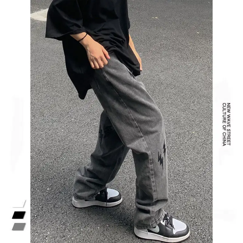 Washed Vintage Black Jeans Men's Leather Embroidered Flash Jeans Mens and Womens Hip Hop High Street Straight Loose Baggy Pants
