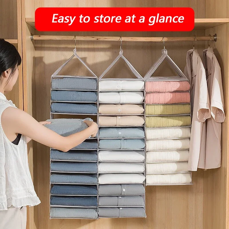 Home wardrobe storage, hanging bags, pants, layered hanging clothes, separated and organized items, fabric storage rack