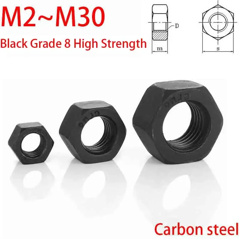 1~100Pcs BlackHexagon Nut M2 M2.5 M3 M3.5 M4 M5 M6 M8 M10 M12 M16 M18 M22 M24 M27 M30 Hex Nuts DIN934 BlackGrade 8 High Strength