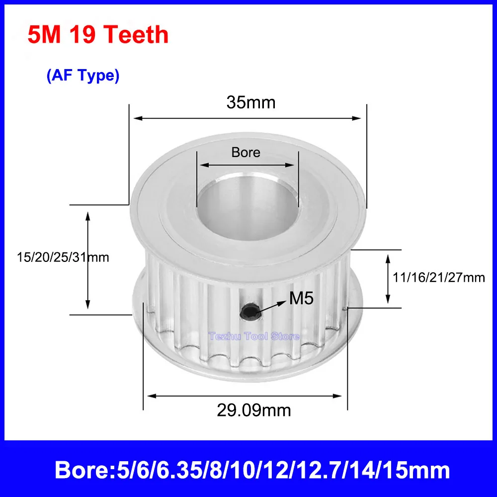 1PCS HTD 5M Timing Pulley 19 Teeth Synchronous Belt Wheel Width 11/16/21/27mm Bore 5mm-15mm Transmission PartsName:HTD 5M Timing Pulley Material:Aluminum alloyWidth:11mm 16mm 21mm 27mm Bore:5/6/6.35/8/10/12/12.7/14/15mmBore:Round Bore/Keyway BoreTeeth:19 Teeth