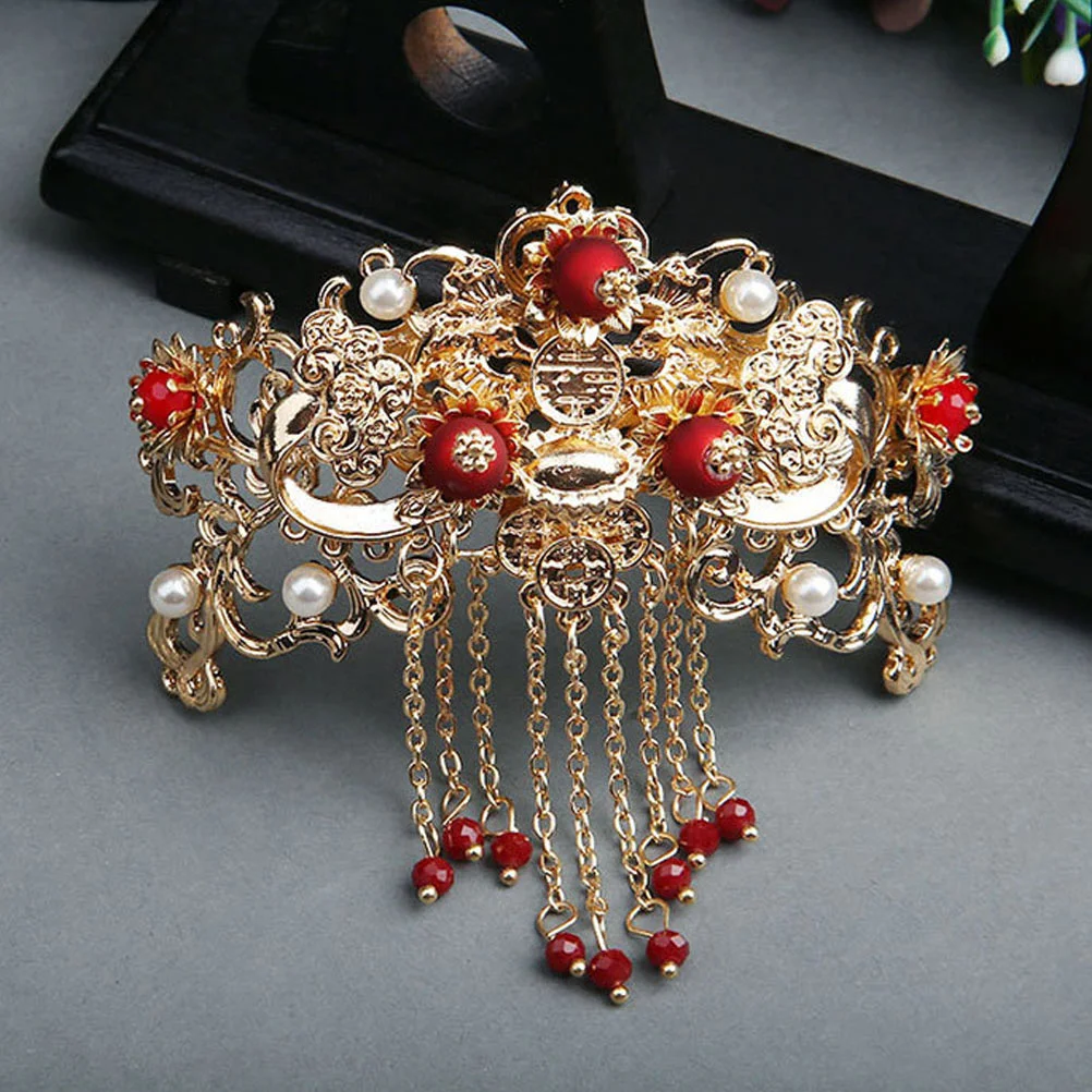2pcs Traditional Hair Clip Side Comb Wedding Bride Headwear Chinese Japanese Style Accessories Wedding Jewelry Hair Clip Red