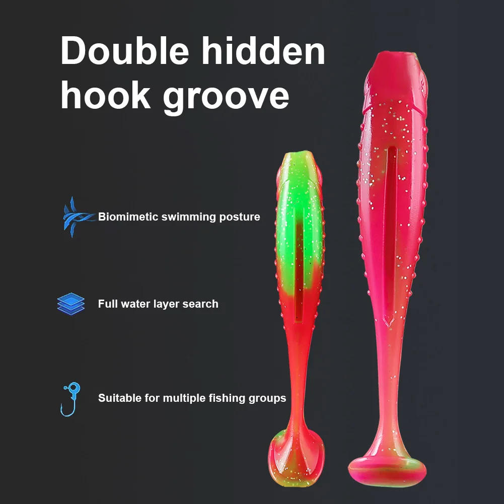5Pcs Fishing Lures 100mm 9g T Tail Soft Lures Artificial Baits Swimbait Soft Baits for Pike Bass Lure Feature: 1 Soft and Palatable Design: The tender body of those fishing lures is designed for easy biting, ensuring they do not obstruct the fish's mouth This feature enhances their effectiveness by way of making them extra attractive to fish 2 and Tear-Resistant: Constructed with strong, bendy material, these soft lures are highly resistant to tearing and biting, providing long-lasting use even under not easy circumstances 3 Anti-Snag Hook Design: Featuring dual hidden hook slots, those wobblers are much less likely to snag on the bottom, guaranteeing steady swimming motion and reducing the chance of wasting your entice 4 Reflective Spots: Equipped with reflective spots, these synthetic baits have a robust fish-attracting effect, rising visibility and enticing more fish to strike 5 T-Tail Design for Enhanced Attraction: The T-tail form creates a strong turbulence effect in the water, efficiently stirring up waves and enhancing the swimbait's capacity to attract fish Specification: Origin: Mainland China Size: 100mm/3 Material: TPR Color: red green Main fish species: black carp, black fish, sea bass, mandarin fish Note: Due to different computer screen settings and lighting conditions, the actual colour of the thing may differ barely from the photographs Thanks for your understanding! Please allow a 1-2 cm difference in measurements because of manual measuring five x Fishing Lures