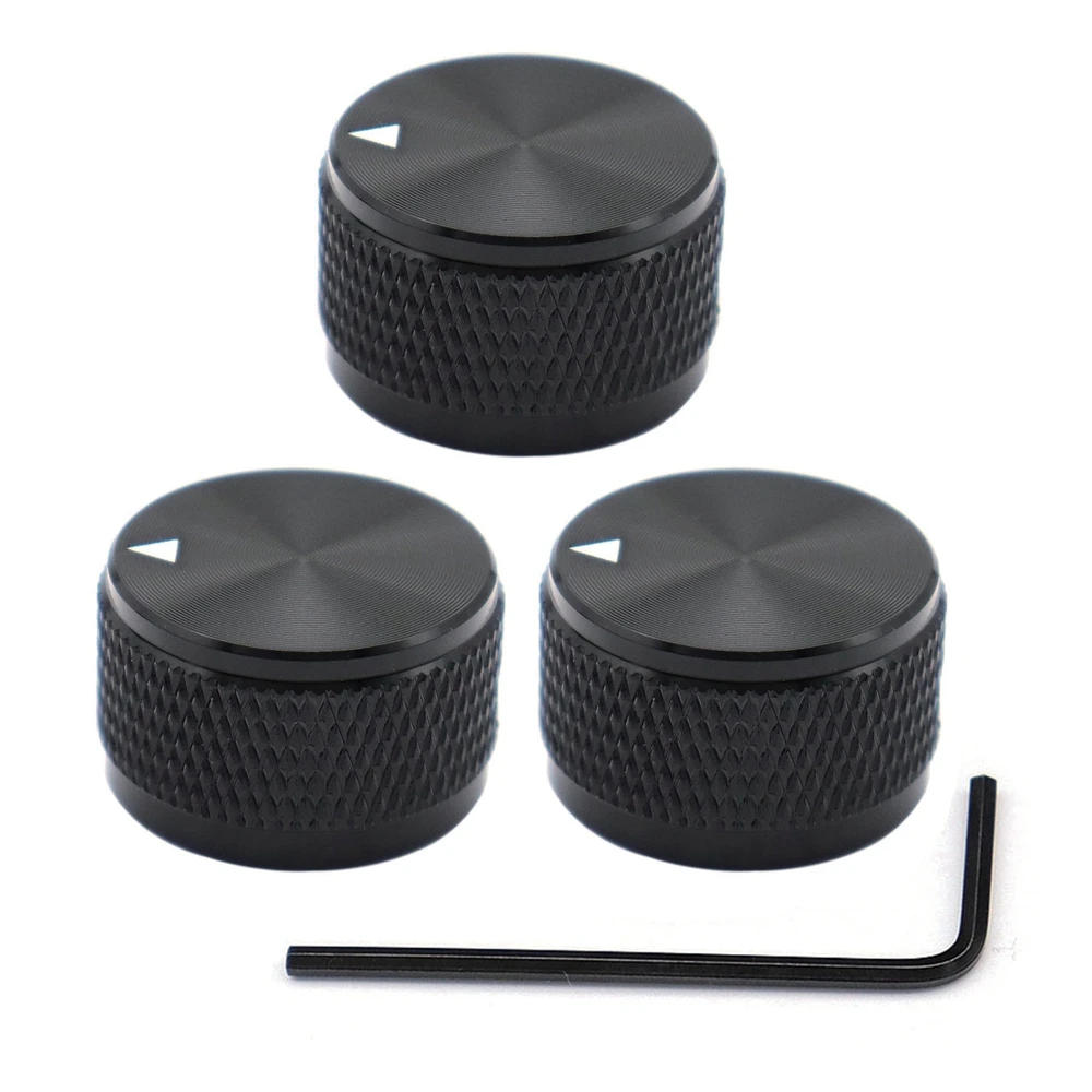 Universal 1/4" innder diameter knobs with set screw,Top with arrow indicator; Compatible with most stable shaft, cut up shaft or "D" shaft pots When you put in them on split shaft pots, please make sure align the set screw parallel to the cut up gap to circumvent crashing your pots shaft Universal Knobs designed to slot Guitar/Bass/Amplifier/Preamps/Power Amplifier or other Audio Equipments with 1/4" shaft potentiometers Set screw allow you to lock the knobs into function and not using a option of falling off Well made flawless finish knobs with out burrs or sharp edges, complete aluminium knobs with none plastic inserts Material: Aluminum alloy Color: Black, Sliver,Gold,Blue,Red Size:24x 15 (D*H)-------Please talk over with the size diagram for details Package contains:3pcs/4pcs Guitar Metal Knobs(with 1pcs Wrench)