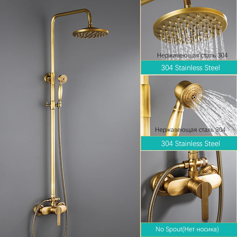 Antique Brass Bathroom Shower Faucet 8 Inch Rainfall Shower Head Rotatable Tub Spout Wall Mounted Outdoor Shower System
