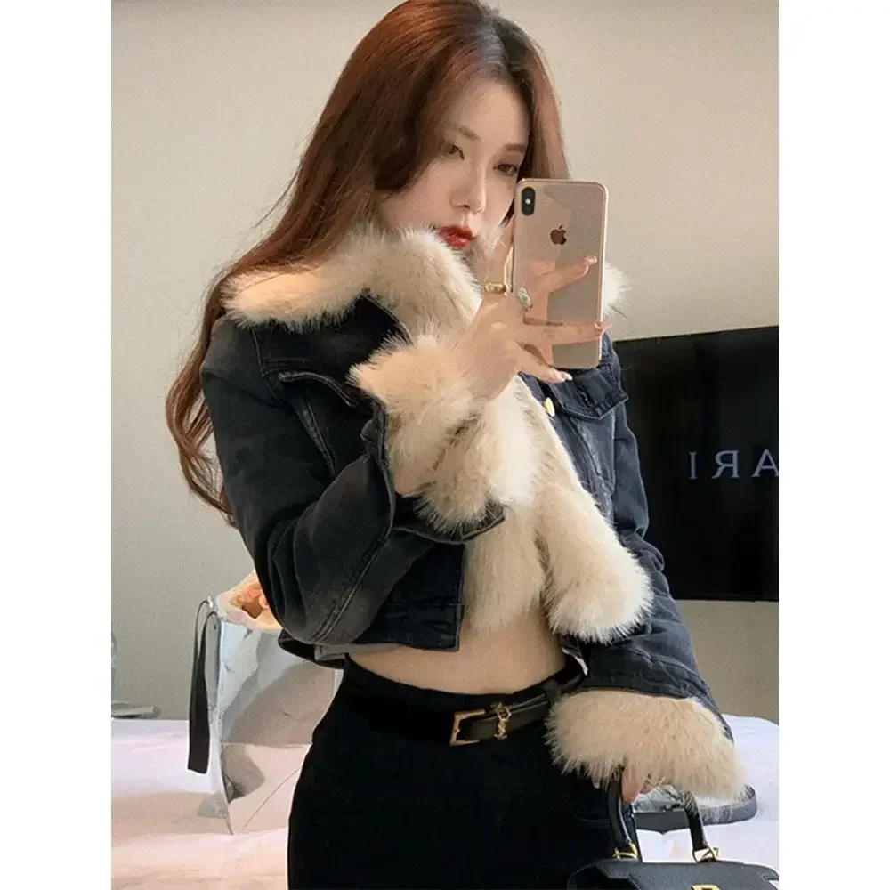 Design Sense Niche Patchwork Fur Collar Jacket Denim Short Coat Women Autumn Winter 2023 New Outerwear Casual Versatile Street